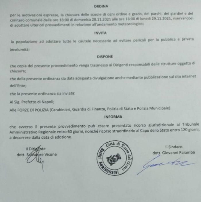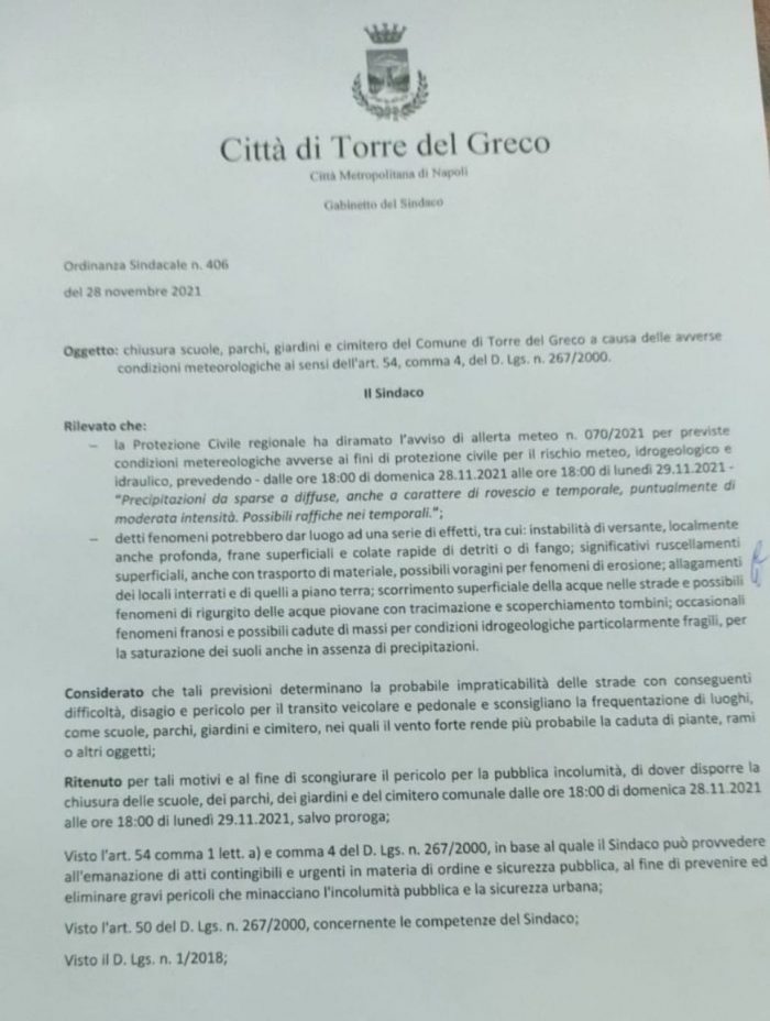 Si comunica che, come da ordinanza del Sindaco del Comune di Torre del Greco, qui allegata, la scuola resterà chiusa il giorno lunedì 29 novembre per allerta meteo e che, trattandosi di chiusura, non è prevista la DAD.