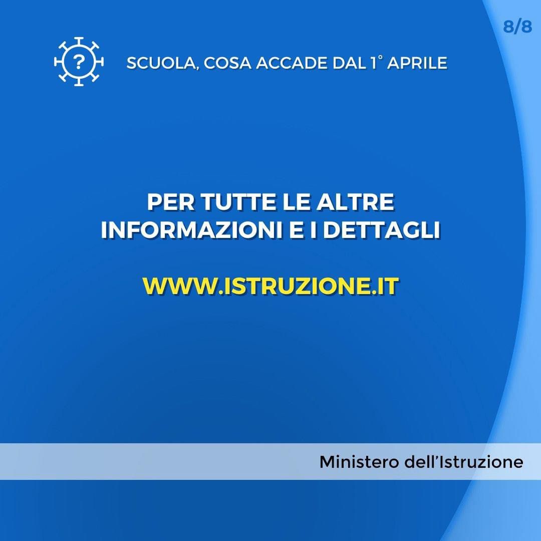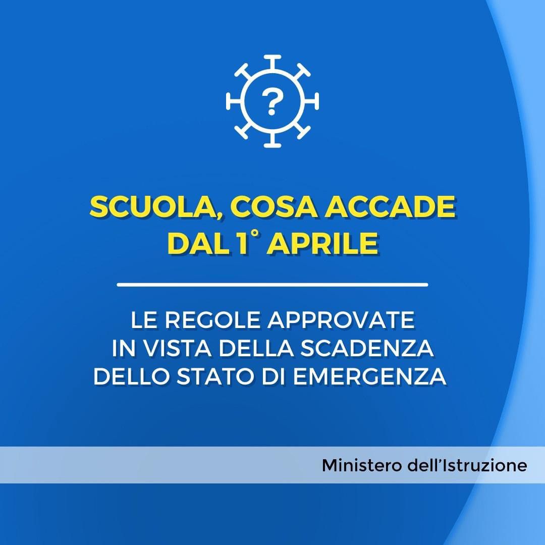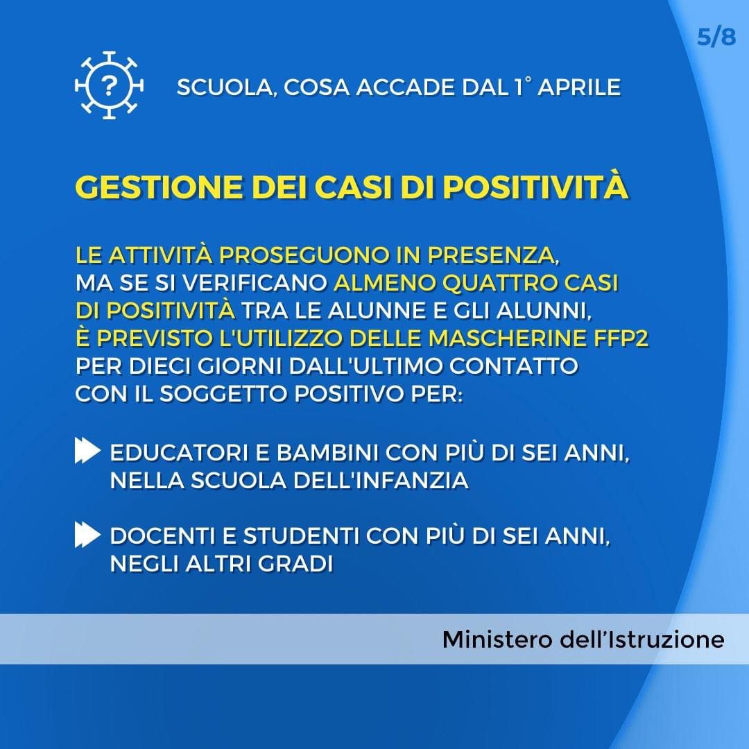 Si riportano, in allegato, in sintesi, le nuove Regole relative alla gestione dei casi di positività da Covid-19 e dei contatti, in vigore nella scuola dal 1 aprile .