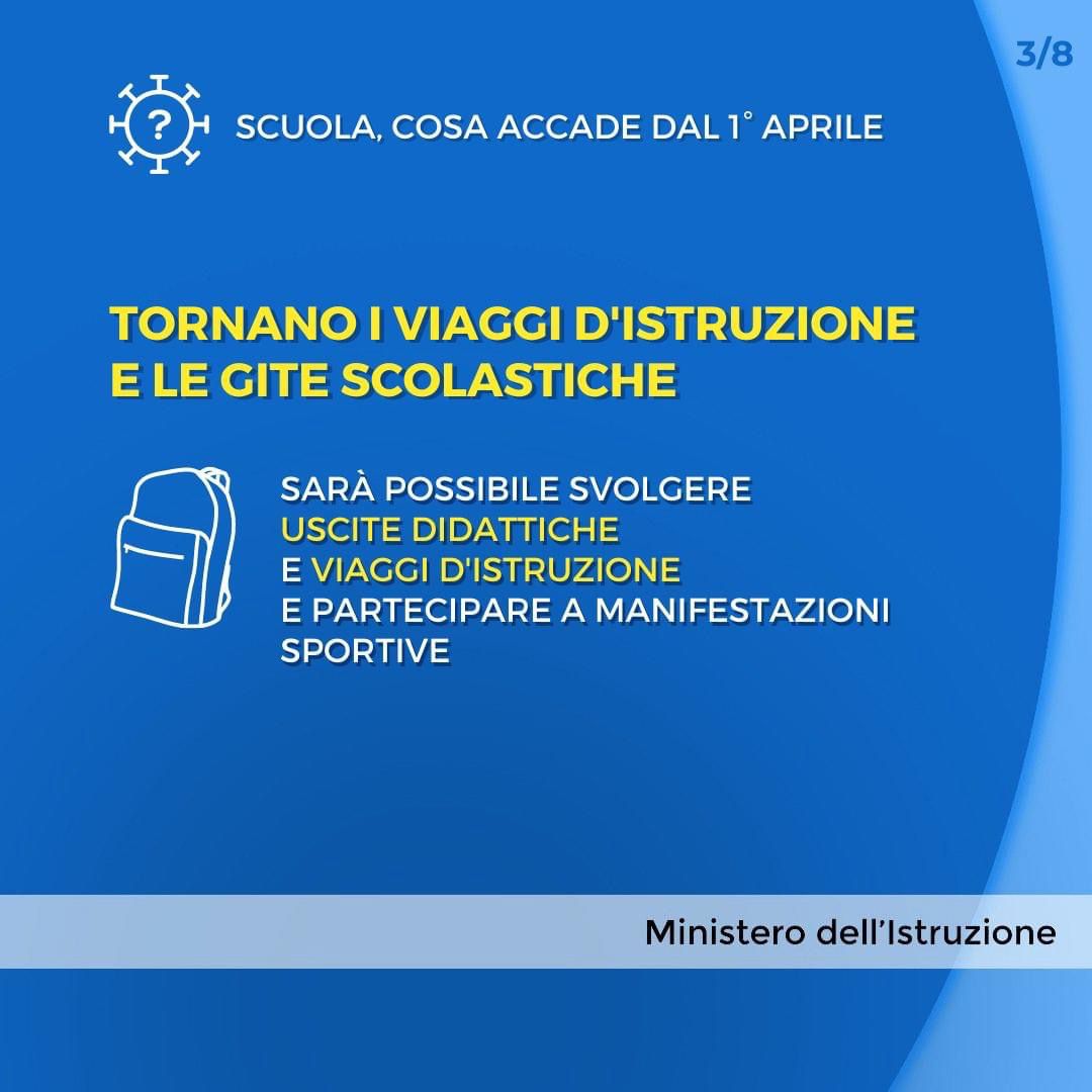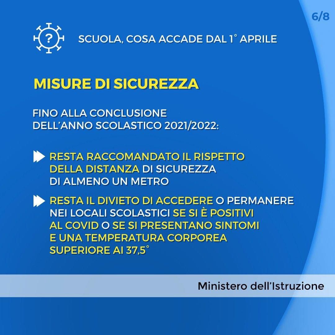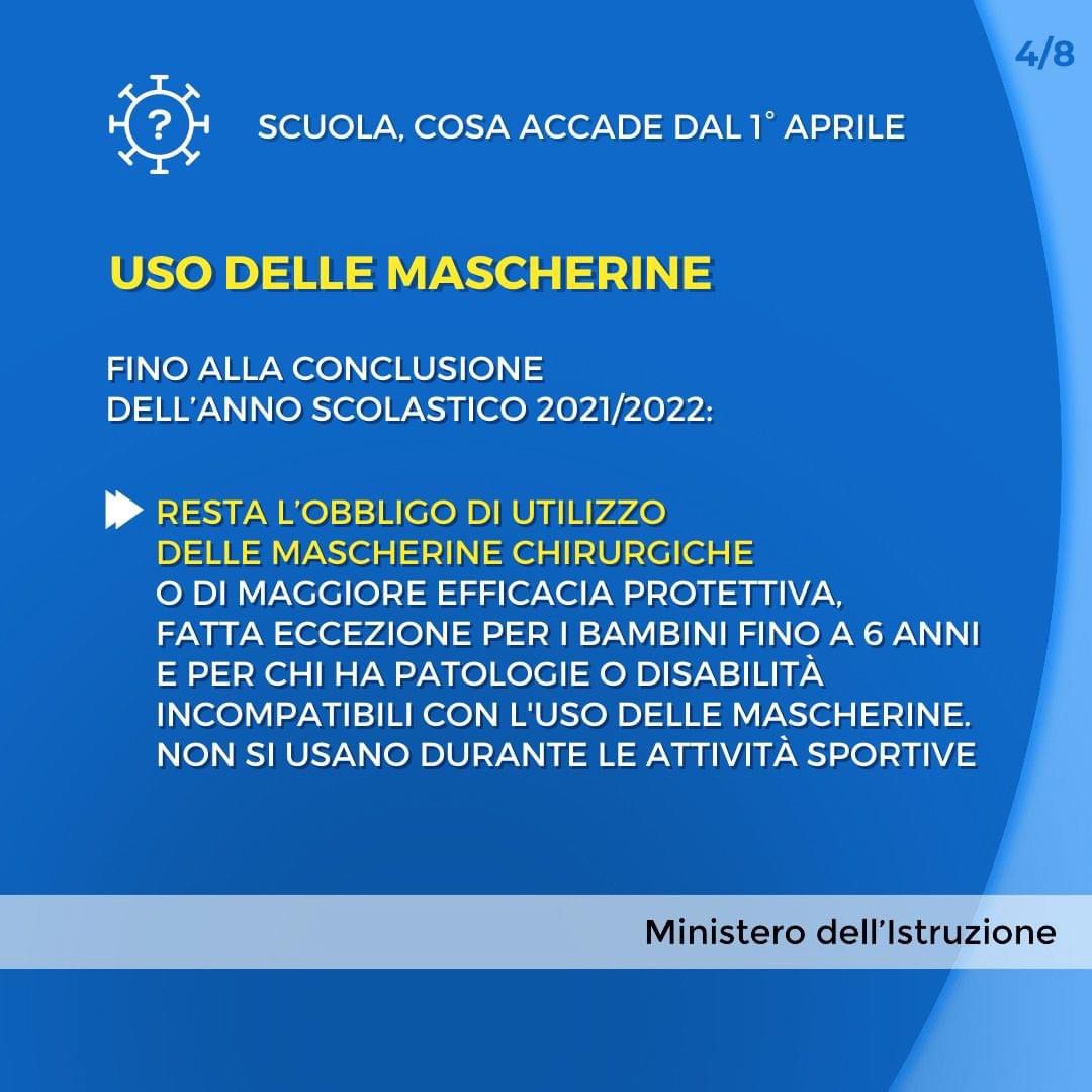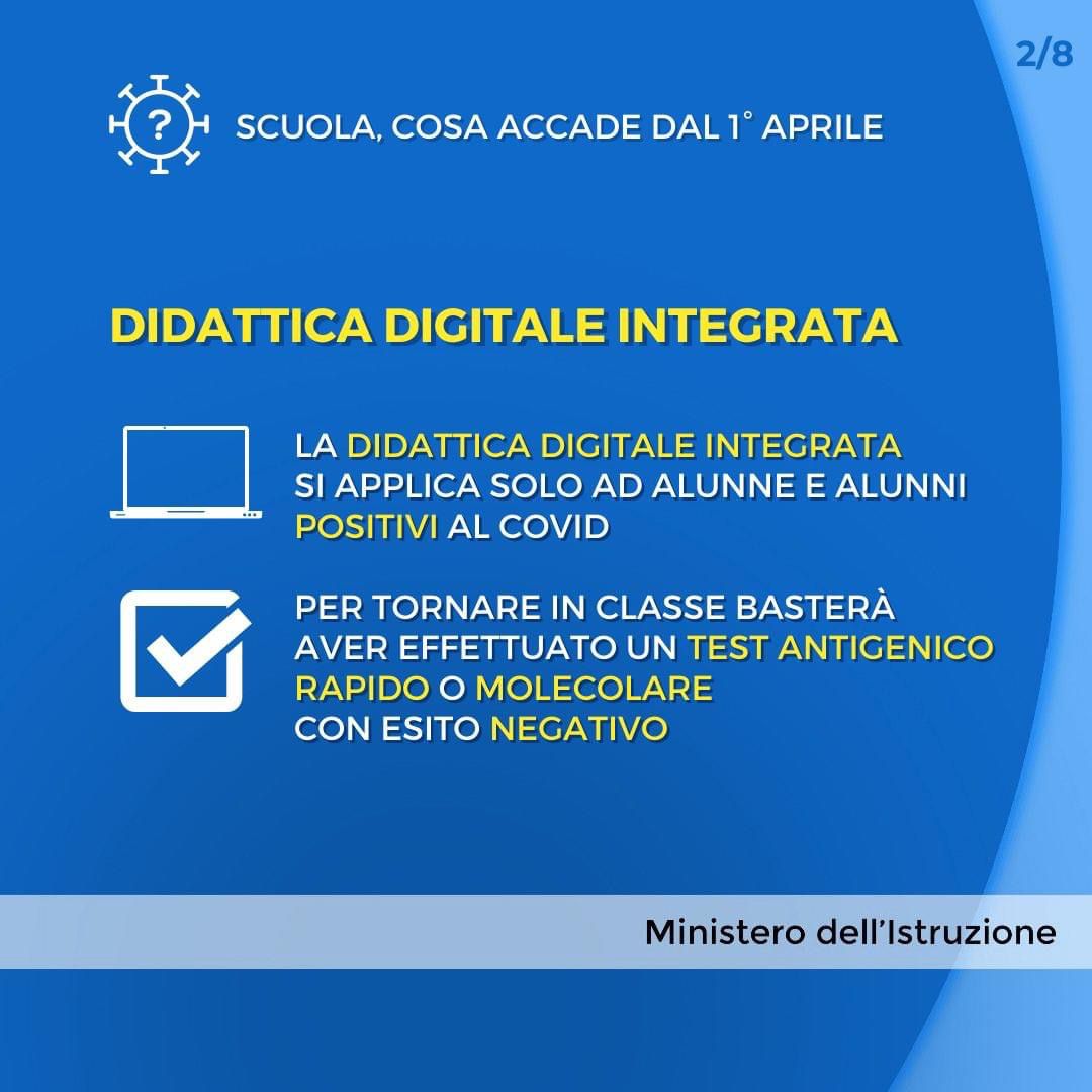 Come disposto dal D.L. n. 24 del 24 marzo 2022, in vigore dal 1 aprile 2022, tutti gli alunni collocati in Didattica a distanza, non positivi all’infezione da SARS-CoV-2 e non nella condizione di grave patologia di cui al Decreto Legge suindicato, sono invitati a rientrare a scuola in presenza da lunedì 4 aprile 2022.